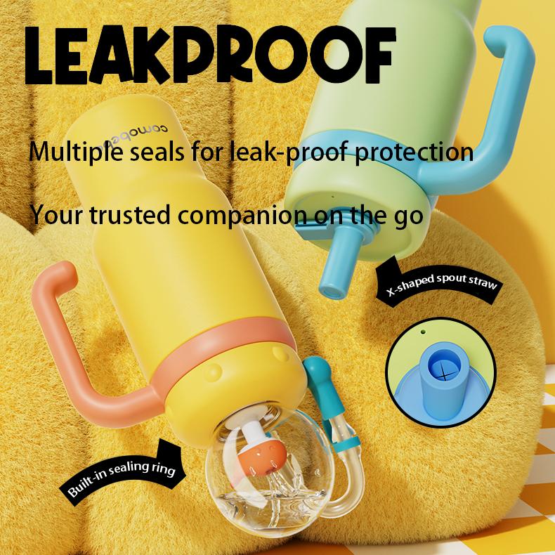 [Leak and Spill Proof] Features an integrated sealing ring and straw cover. The sturdy flip-top lid and cross-cut straw design make storage hassle-free, preventing spills, leaks, and messes[Easy to Use] Comes with 2 lids (fountain lid and straight-drink lid) for dual drinking modes, adding fun and versatility. The ergonomically designed handle makes it easy to grip and drink from any angle. The silicone base reduces noise prevents slipping, and adds stability. A built-in anti-colic valve minimizes discomfort and choking risksBrand: comobebeCapacity: 710ml/24 oz.About This ProductMaterials: Stainless steel, Silicone, PP
