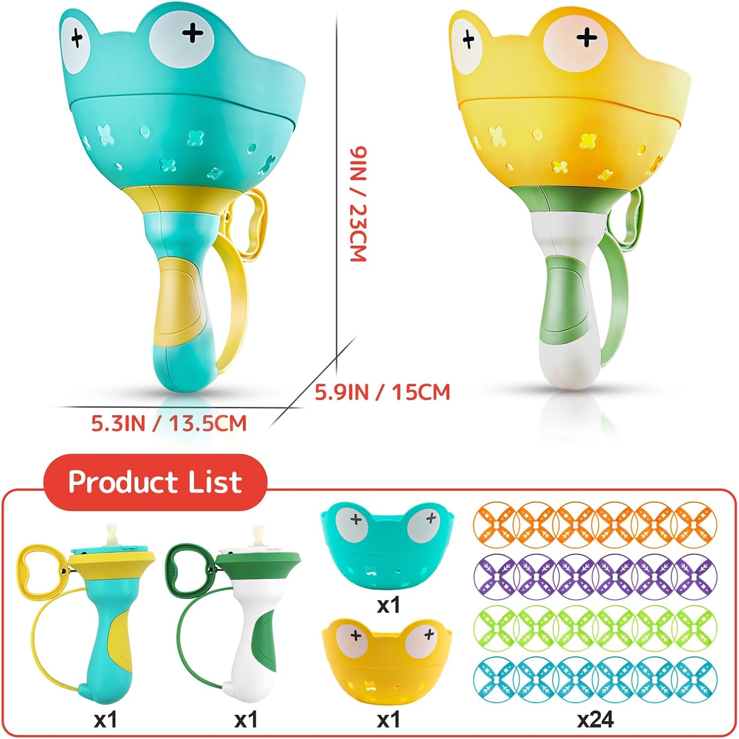 Games for Kids Ages 4-8: Outdoor games with 24 discs and 2 Frog Hand Launch Catcher. Easy to play. Children just need to pull the launchers pull ring and the frog's head will launch flying disc, which children need to catch with launchers, and children will have fun trying to chasing them. The one who catches the most discs wins