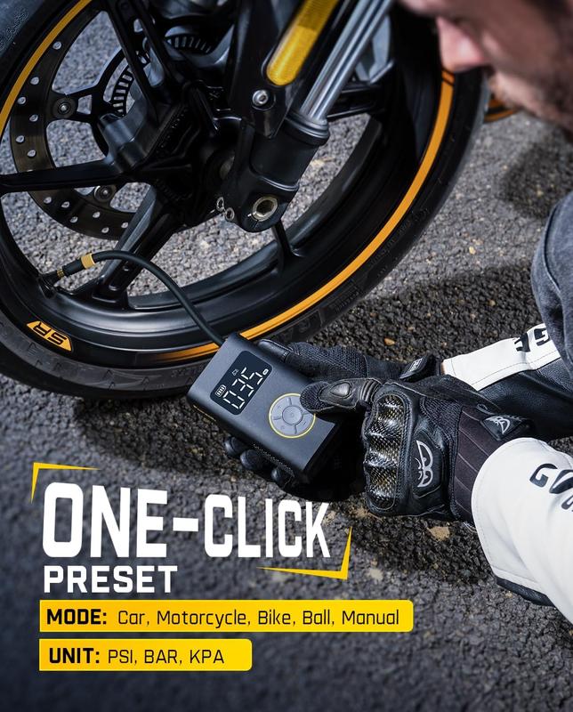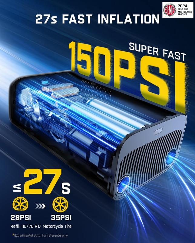 -Cordless Fast Inflation: With the built-in high- performance chip, X9 electric tire inflator can quickly provide 17L/Min inflation rate and 150PSl high-pressure. It can inflate a wide range of inflatables from motorcycles, bikes to sport equipments like floats, air mattresses, balls. Takes only 36 seconds to refill a motorcycle tire (28-35PSl). And fully inflate a motorcycle tire (0-35PSl) within 2 mins.