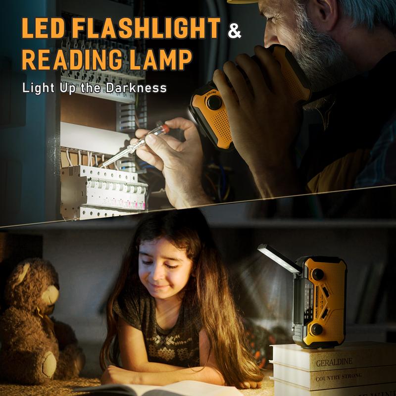 LED Flashlight & Reading Lamp: The emergency crank radio with flashlight and reading lamp is a great alternative for outdoor enthusiasts or the one who needs to walk in dark places. LED Flashlight can illuminate your place and keep you away from the obstacles, so you don't have to worry about tripping over something when you get up at midnight. Pulling up the solar panel, the solar radio becomes the reading lamp which makes reading easier at night.