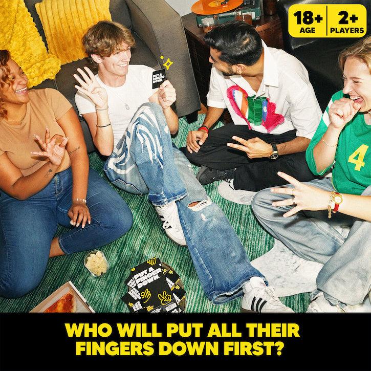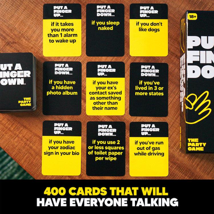 PUT A FINGER DOWN: is the viral-trend-turned-party game that will have everyone talking!PLAY WITH ANYONE: meant for 2+ people and simple to play, Put A Finger Down is the perfect card game to spice up holidays, parties, date nights, and more.
